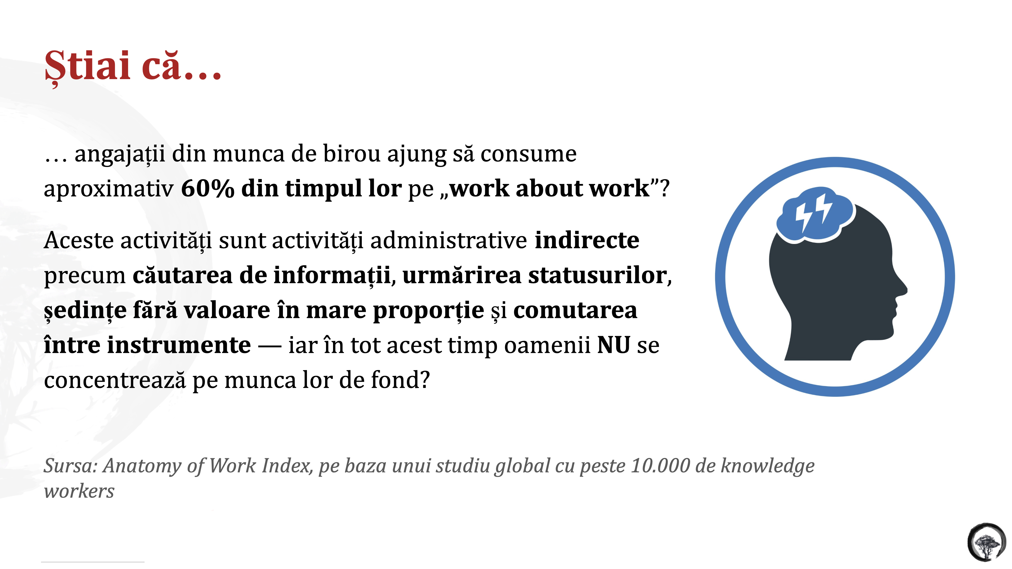 Află care sunt implicațiile faptului că 60% din timpul dedicat muncii intelectuale este consumat pe activități fără valoare legate de organizarea muuncii